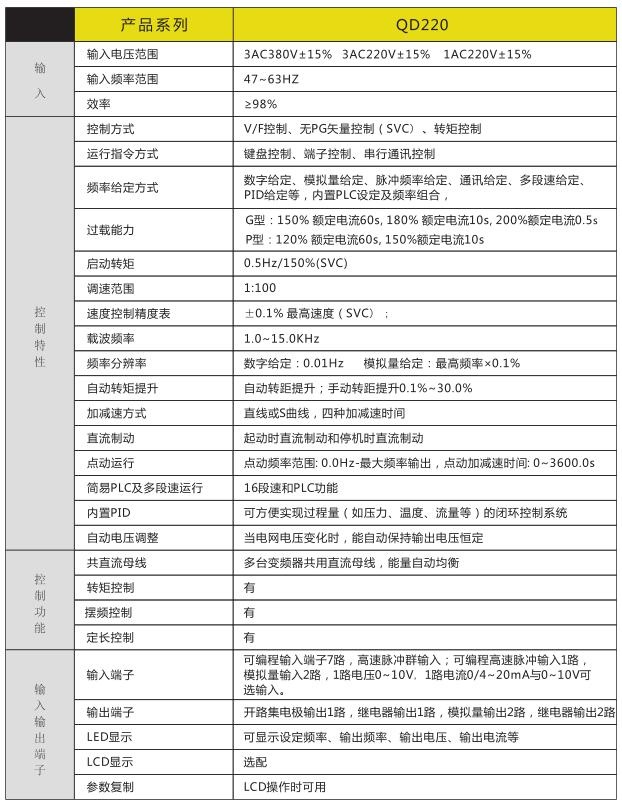 QD220系列矢量通用型變頻器為功能增強型產品,采用DSP控制系統,完成優化的無速度傳感器控制、V/F控制,功能更優化,應用更靈活,性能更穩定。可廣泛應用于風機,泵類負載及速度控制精度、轉矩響應速度、低頻輸出特征有較高要求的應用場合。